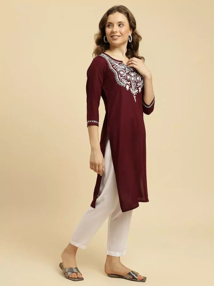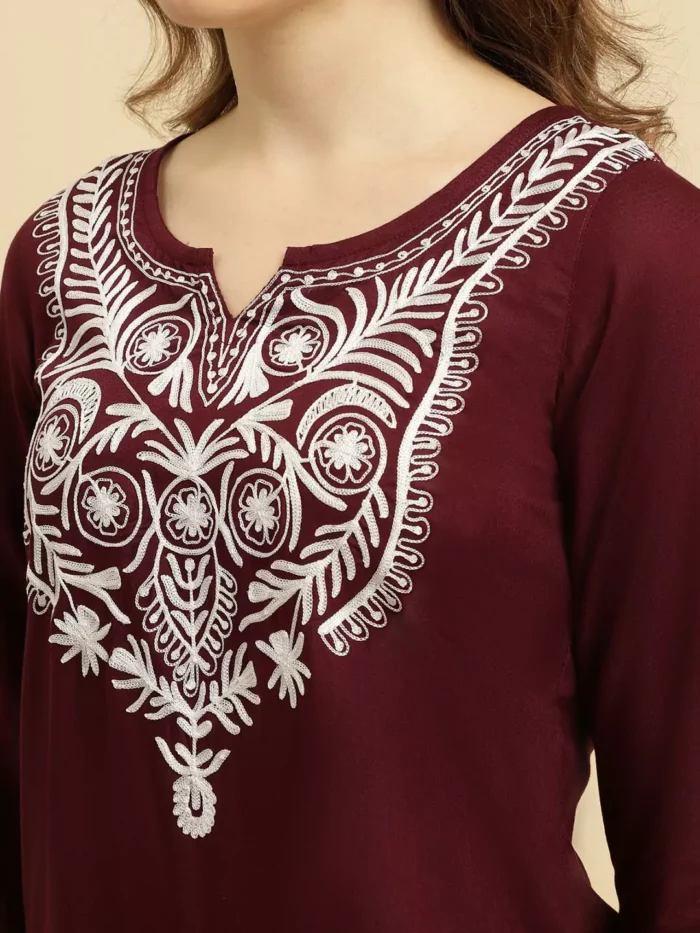 Home Kurtis Wine Silk Embroidered Kashmiri Kurti